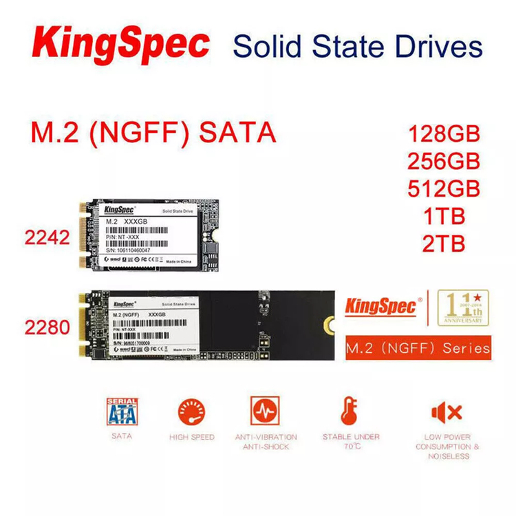 شرکت «کینگ اسپک» محصولی را با نام «NT-XXX» روانه بازار کرده که درواقع یک حافظهی SSD از نوع اینترنال است. این اس اس دی در فرم فاکتور M.2 تولید شده و رابط استاندارد آن برای اتصال SATA III است. حافظهی اس اس دی کینگ اسپک مدل NT-XXX از نوع 2280 بوده که این موضوع هنگام تهیهی آن بسیار با اهمیت است. البته باید به این نکته اشاره شود که شرکت کینگ اسپک دو سایز 2280 و 2240 را با همین مدل ارائه کرده که با توجه به نوع سختافزار خود میتوان دست به انتخاب زد. SSD کینگ اسپک مدل NT-XXX از نوع فلش MLC بهره میبرد. نوع فلش MLC در این محصول باعث شده تا NT-XXX یک انتخاب استاندارد برای کاربران باشد. این حافظهی اس اس دی شرکت کینگ اسپک در ظرفیتهای مختلفی ارائه شده است. ظرفیت این اس اس دی برابر با 256 گیگابایت بوده که مقدار مناسبی برای یک حافظهی SSD اینترنال به شمار میرود و برای کامپیوترهای حرفهای مناسب است. سرعت انتقال اطلاعات در این اس اس دی برابر با 570 مگابایت برای خواندن و 540 مگابایت برای نوشتن است. SSDها با توجه به اینکه برای ذخیرهسازی اطلاعات از قسمتهای مکانیکی استفاده نمیکنند، در برابر بسیاری از صدمات مقاوم هستند.